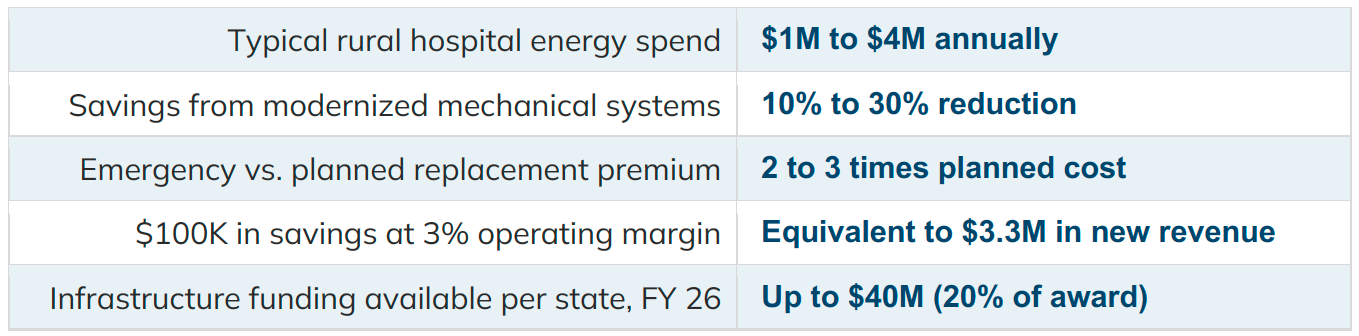 What is not allowed is new construction. But replacement of existing equipment is explicitly permitted and that covers the most pressing deferred maintenance items rural hospitals carry: HVAC systems, boilers, chillers, building automation systems, and lighting infrastructure. The federal authorization is not ambiguous. The gap is at the state level, where distribution criteria have been designed around technology and workforce priorities rather than the infrastructure category Congress authorized.