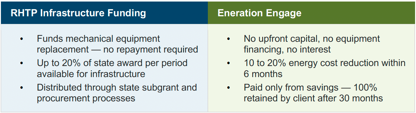 Eneration's Engage model is designed precisely for this. We establish a baseline, implement energy conservation measures, and are paid only from the savings we generate. RHTP funds the capital replacement. Eneration captures and sustains the energy performance gains. The hospital ends up with modernized infrastructure, validated energy savings, and no ongoing cost to either program.