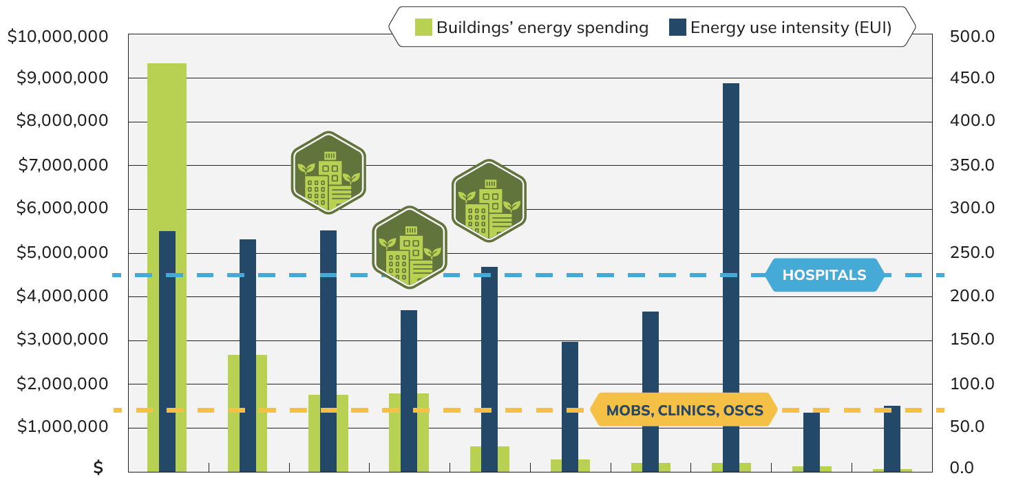 In the chart, green hexagons mark the three chosen buildings. Green bars represent each building's energy spend, while blue bars indicate the building's energy use intensity (EUI) compared to the average hospital and clinic in the same climate zone, shown as blue and orange dashed lines.